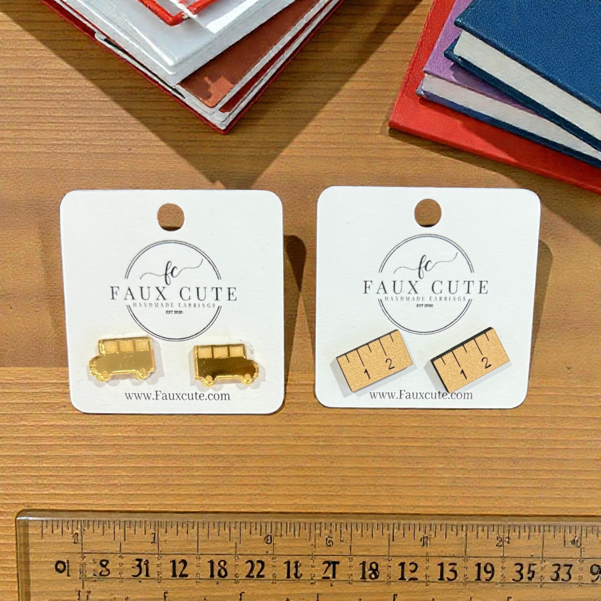Acrylic school buses and wooden ruler stud earrings